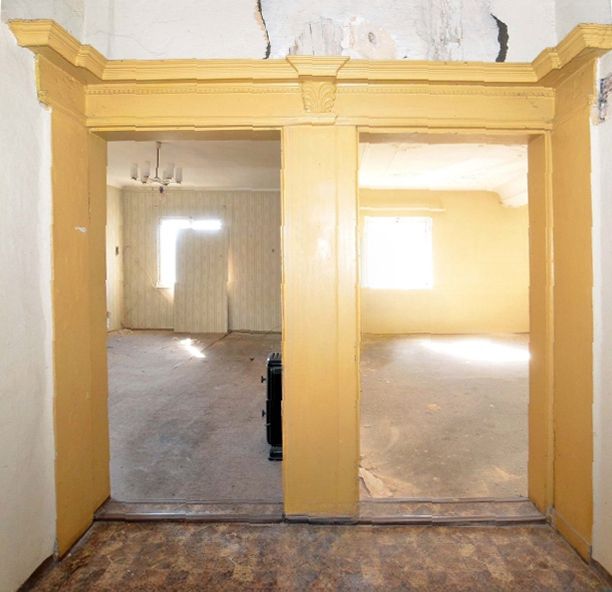 Wendet man sich im Treppenhaus nach links, so gelangt man durch einen kurzen Flur zu einer spätbarocken Doppeltürrahmung. Diese besteht aus zwei rechteckigen Durchgängen, die durch ein zentrales Trumeau getrennt und von seitlichen Wandpilastern flankiert werden. Das dominierende Element ist das schwere, mehrfach gestufte Abschlussgesims, das über den Pilastern und dem Mittelpfosten tief verkröpft nach vorne hervorspringt. Unterhalb des Gesimses verläuft ein feiner Zahnschnitt als klassisches antikisierendes Dekorelement. Die Wandungen der Laibungen sind schlicht gehalten, während die Frontseiten der Pilaster eine feine Rahmung durch Profilleisten aufweisen. Die architektonische Strenge, kombiniert mit der plastischen Ausformung der pilasterartigen Gewände spricht für eine Entstehung der Türrahmung in der Zeit des Übergangs vom Barock zum Klassizismus, also wohl um die Mitte bis in die zweite Hälfte des 18. Jahrhunderts.