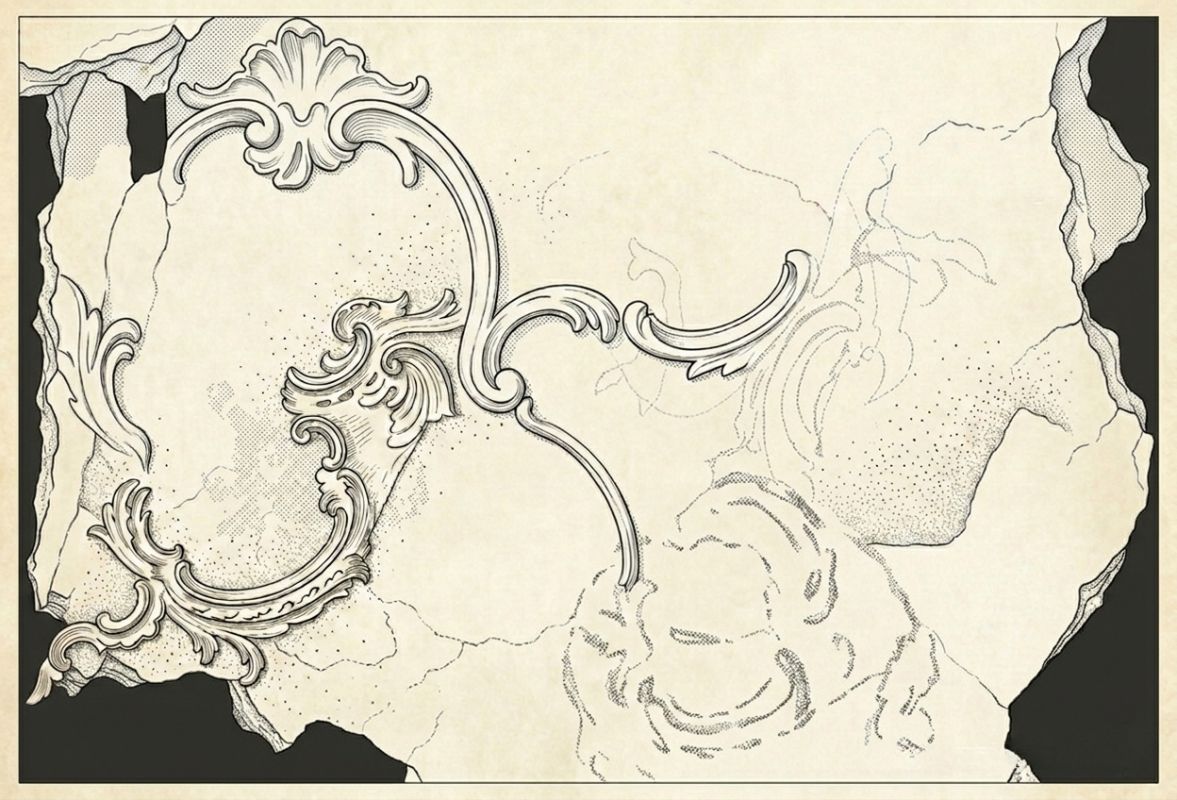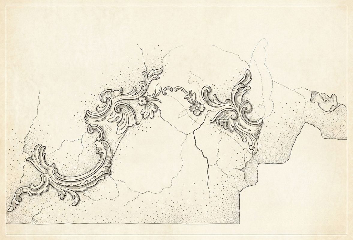 Detailzeichnung der vom Restaurator freigelegten Stuckkartusche