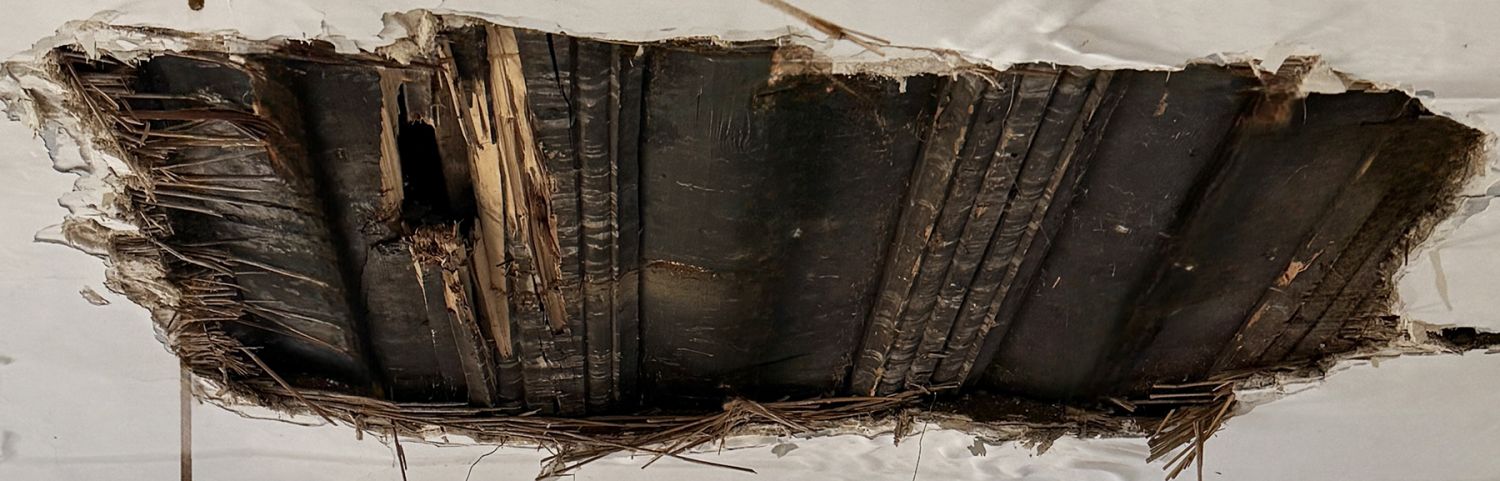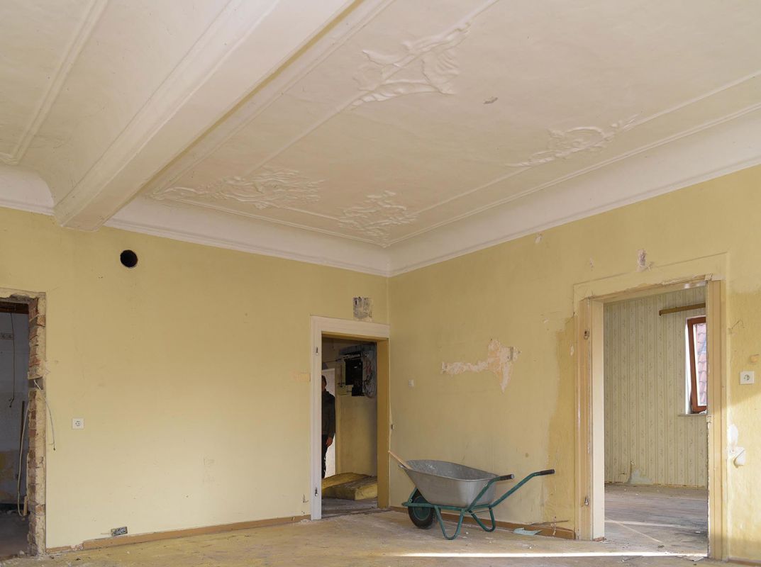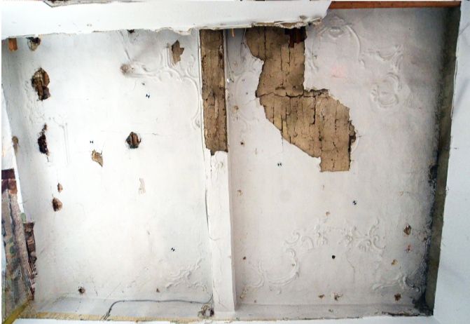 Ein bei der denkmalfachlichen Untersuchung des Gebäudes angelegtes „Fenster“ durch die Stuckdecke des 18. Jahrhunderts erlaubt einen Blick auf ursprüngliche Balken-Bohlendecke des Saals. Nur hier weisen die Balken eine Profilierung mit flachen Kehlen und Wülsten auf, bei den übrigen Balken-Bohlendecken im Haus wird auf ein solches Dekor verzichtet.