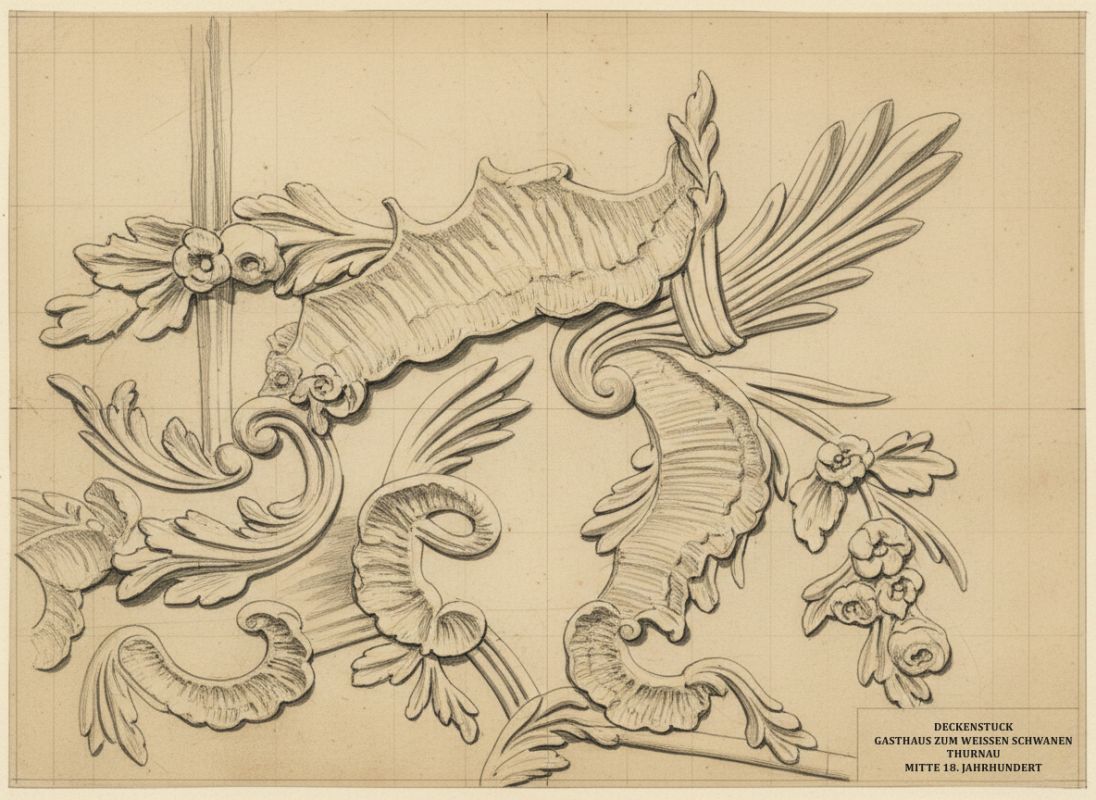 Die Detailanalysen der Fragmente (Stuck 1 und 2) identifizieren das Dekor eindeutig als Rokoko. Dominant ist das Motiv der Rocaille – jene asymmetrische, muschelartige Ornamentform, die für die Mitte des 18. Jahrhunderts charakteristisch ist. Die Detailzeichnungen belegen ein Repertoire aus schwungvollen C- und S-Bögen, die mit zarten Blütenranken und vegetabilen Elementen verflochten sind. Besonders im unteren Teil des rechten Deckenfeldes zeigt sich eine dichte, fast spielerische Komposition aus Rocaillen.
