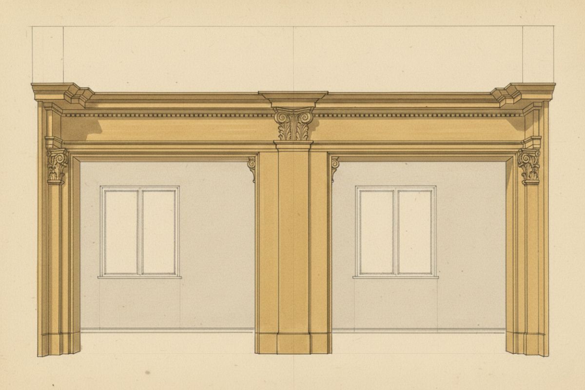 Der Mittelpfosten wird durch eine applizierte Palmetten-Konsole bekrönt, deren plastische Ausformung und stilisierte Blattfächer auf eine historisierende Überformung des 19. Jahrhunderts hindeuten. Anstelle der heutigen, eher isoliert wirkenden Palmette, wird man sich dort ursprünglich wohl ein korinthisches Kapitell vorstellen können. Die historischen Türblätter dieser ungewöhnlichen Doppeltüranlage sind leider nicht erhalten geblieben.